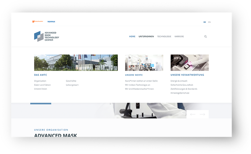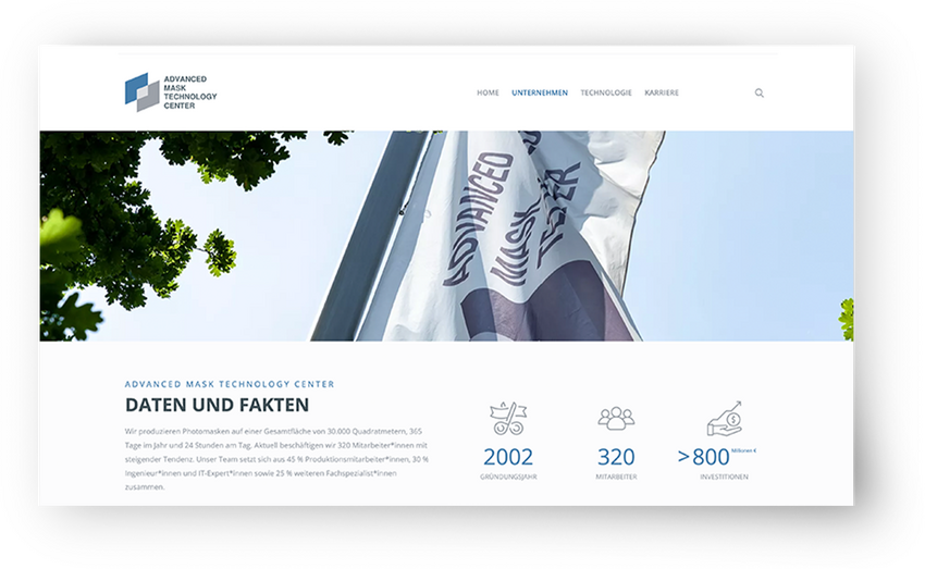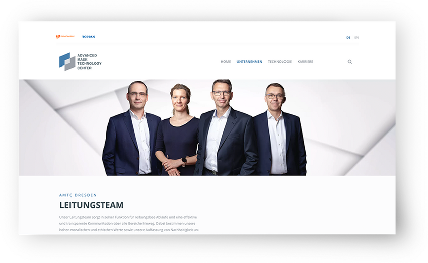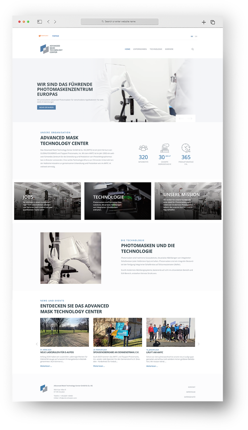 Das AMTC Dresden beauftragte uns mit der Entwicklung einer modernen, informativen und visuellen Webseite, die sowohl den technologischen Anspruch des Unternehmens als auch seine Expertise in der Halbleiterindustrie widerspiegelt. Neben dem Webdesign und der technischen Umsetzung lag ein Schwerpunkt auf der professionellen Fotografie, um sowohl Reinräume als auch Portraits der Mitarbeiter optimal zu präsentieren.